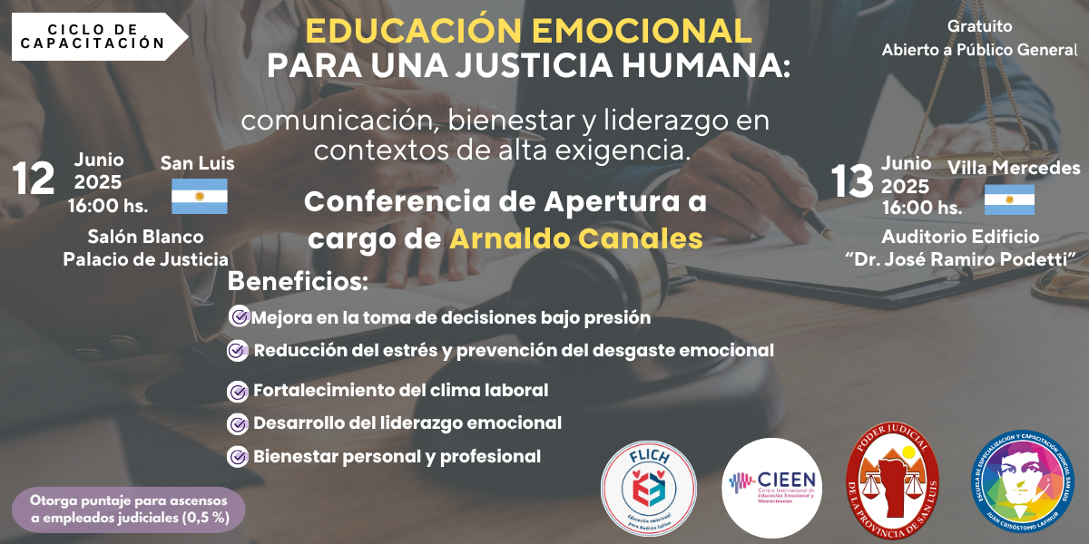 Conferencia 1: “El impacto de la educación emocional en el trabajo judicial: bienestar, convivencia y sentido ético”, el 12 de junio de 2025 a las 16:00 hs, en el Salón Blanco del Palacio de Justicia, San Luis.